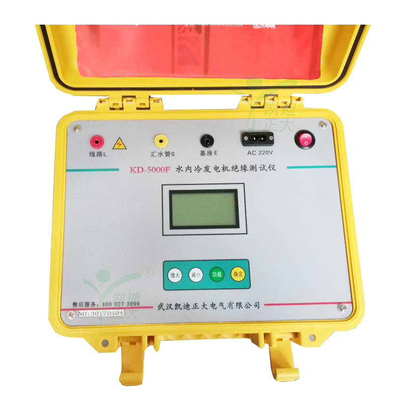 KD5000F水冷發(fā)電機絕緣電阻測試儀專用于水內(nèi)冷發(fā)電機的絕緣測量試驗,同時也可用于試驗室或現(xiàn)場做其它材料的絕緣測試,輸出電流大于40mA。輸出電壓最大5000V,可測高達100GΩ的絕緣電阻。內(nèi)含高精度微電流測量系統(tǒng)、數(shù)字升壓系統(tǒng)。只需要用一條高壓線和一條信號線連接試品即可測量。測量自動進行,結(jié)果由大屏幕液晶顯示,并將結(jié)果進行存儲。不需對水極化電勢進行補償調(diào)節(jié),機座與匯水管間的電阻小至3kΩ,也可保證測量準確度,水阻大于80kΩ時,可保證測試準確度。并自動計算吸收比(R60S/R15S)和極化指數(shù)(R10min/R1min),自動儲存15秒、1分鐘、10分鐘的絕緣電阻值。也可用于變壓器等其他電力設備的絕緣電阻測試。