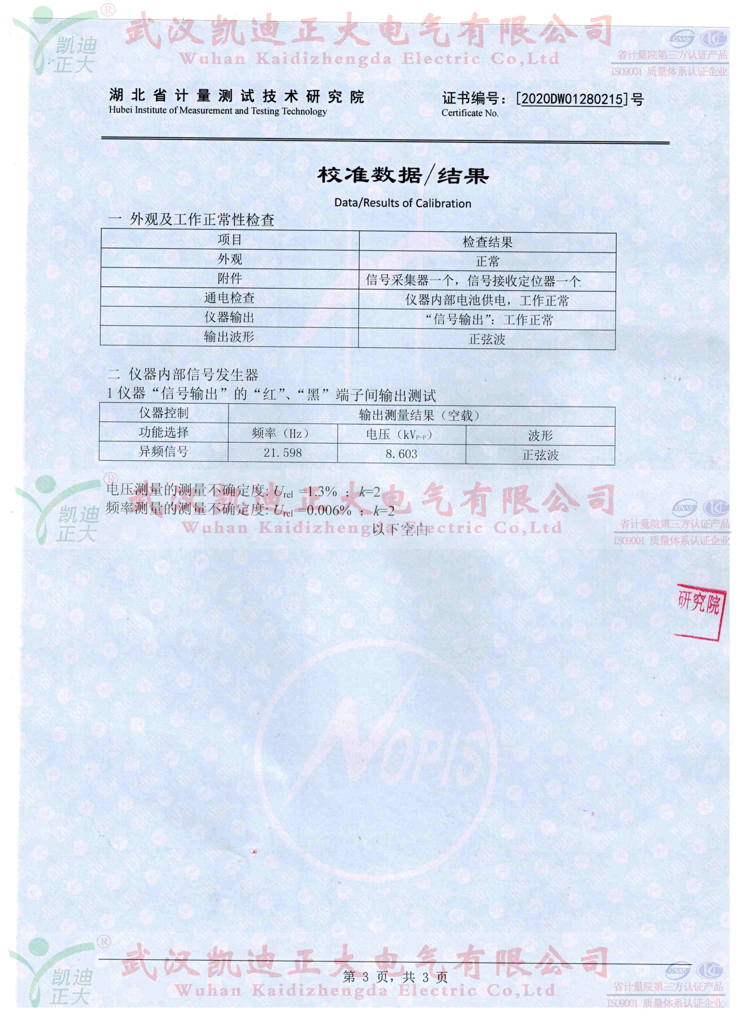 我司抽檢10套10kV配網單相接地故障定位儀送往湖北省計量測試技術研究院校準,獲得電學所檢測設備DS0S054A數字示波器標準設備的數據:輸出波形正玄波、異頻信號21.598Hz、輸出電壓8.603kV、頻率測量的不確定度0.006%。符合武漢凱迪正大公司和國家電力規(guī)程標準。