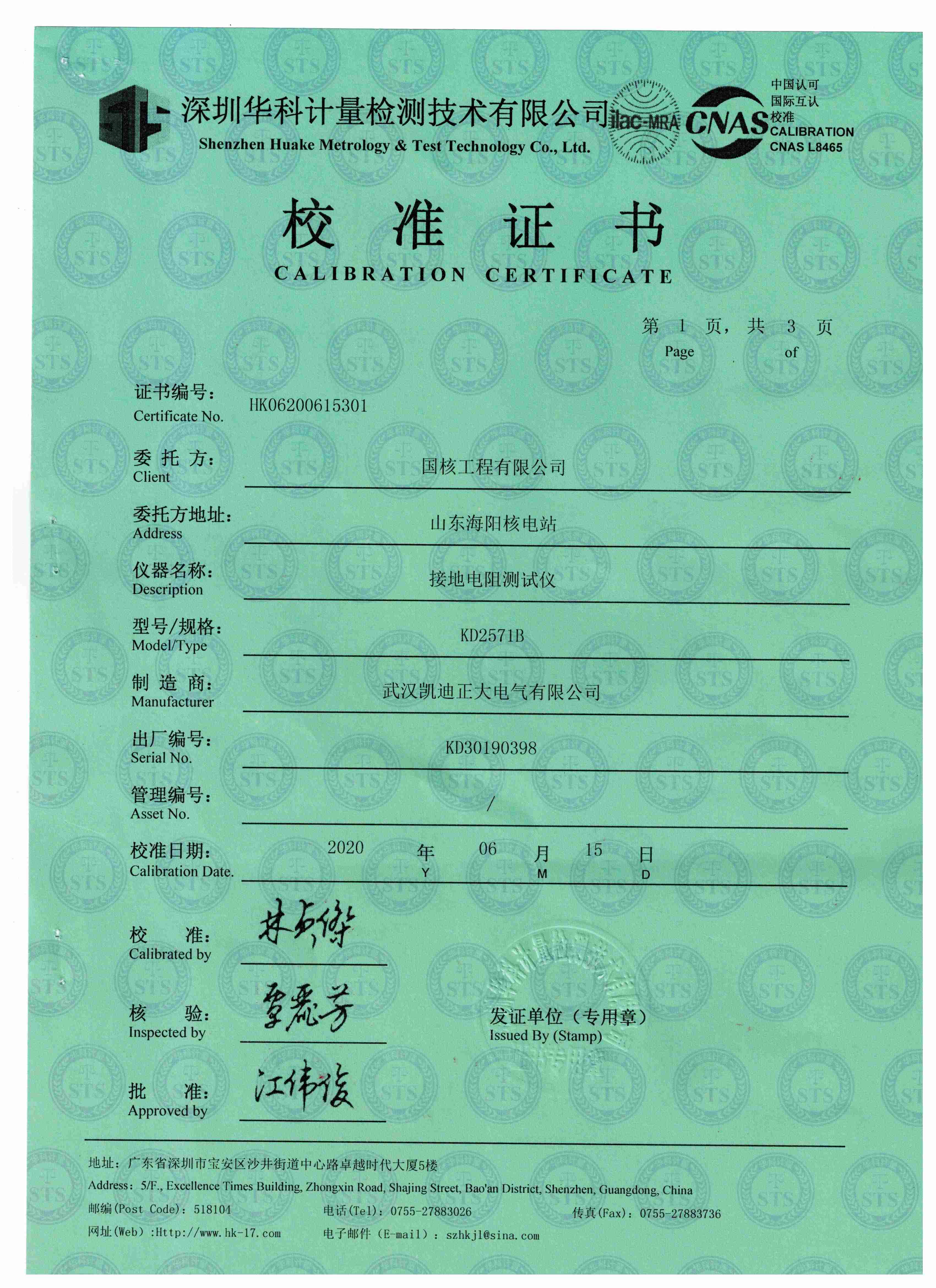 海陽核電購置KD2571B接地電阻測試儀獲得校準(zhǔn)證書