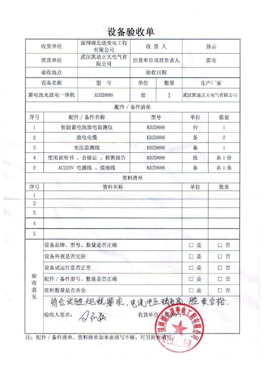 就在前幾日國網湖北送變工程有限公司采供了我司KDZD886蓄電池充放電一體機一套,并且驗收成功,驗收結果也達到試驗規(guī)程要求,電流電壓精度都很高,驗收結果表示很滿意!KDZD886蓄電池充放電一體機主要配件有KDZD886智能蓄電池檢測儀1臺,KDZD886放電電纜2條,KDZD886電壓檢測線1條,使用說明書,合格正,檢測報告各一份,KDZD886 AC220V電源線,接地線各一條,湖北省送變電工程公司是湖北省電力公司的合資子公司,隸屬于國家電網公司,是一家從事輸變電工程施工的省級專業(yè)公司,具有國家電力工程施工總承包壹級企業(yè)資質和一級承裝(修、試)電力設施許可證;通過了國家質量管理體系、環(huán)境管理體系和職業(yè)健康安全管理體系的認證?,F(xiàn)有職工2076人,具有中高級專業(yè)技術資格人員219人。