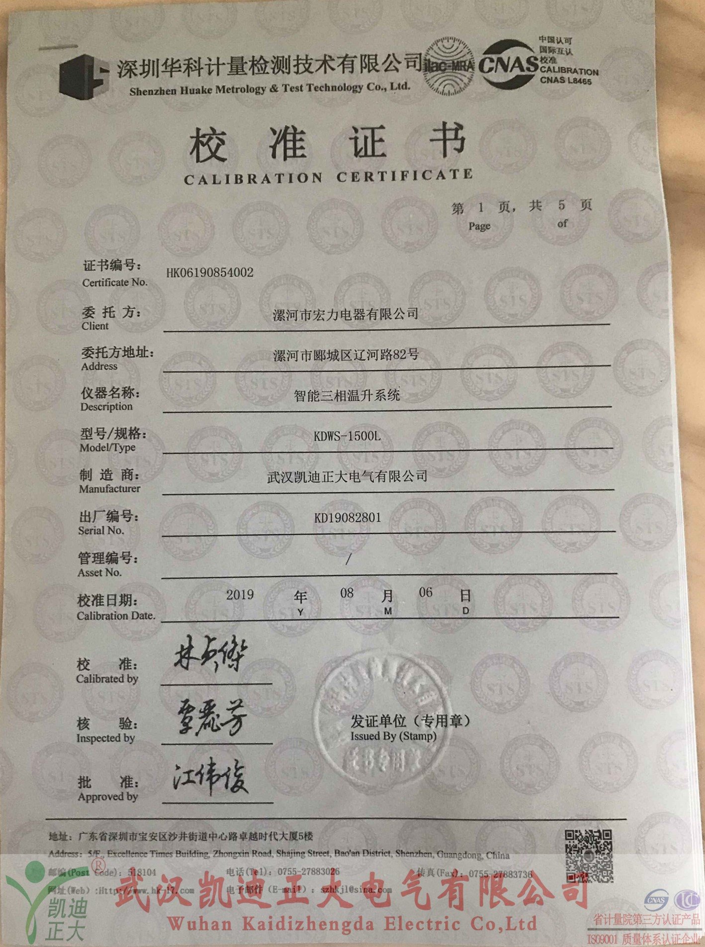 漯河宏力電器采購我司設(shè)備獲得深圳華科計量證書