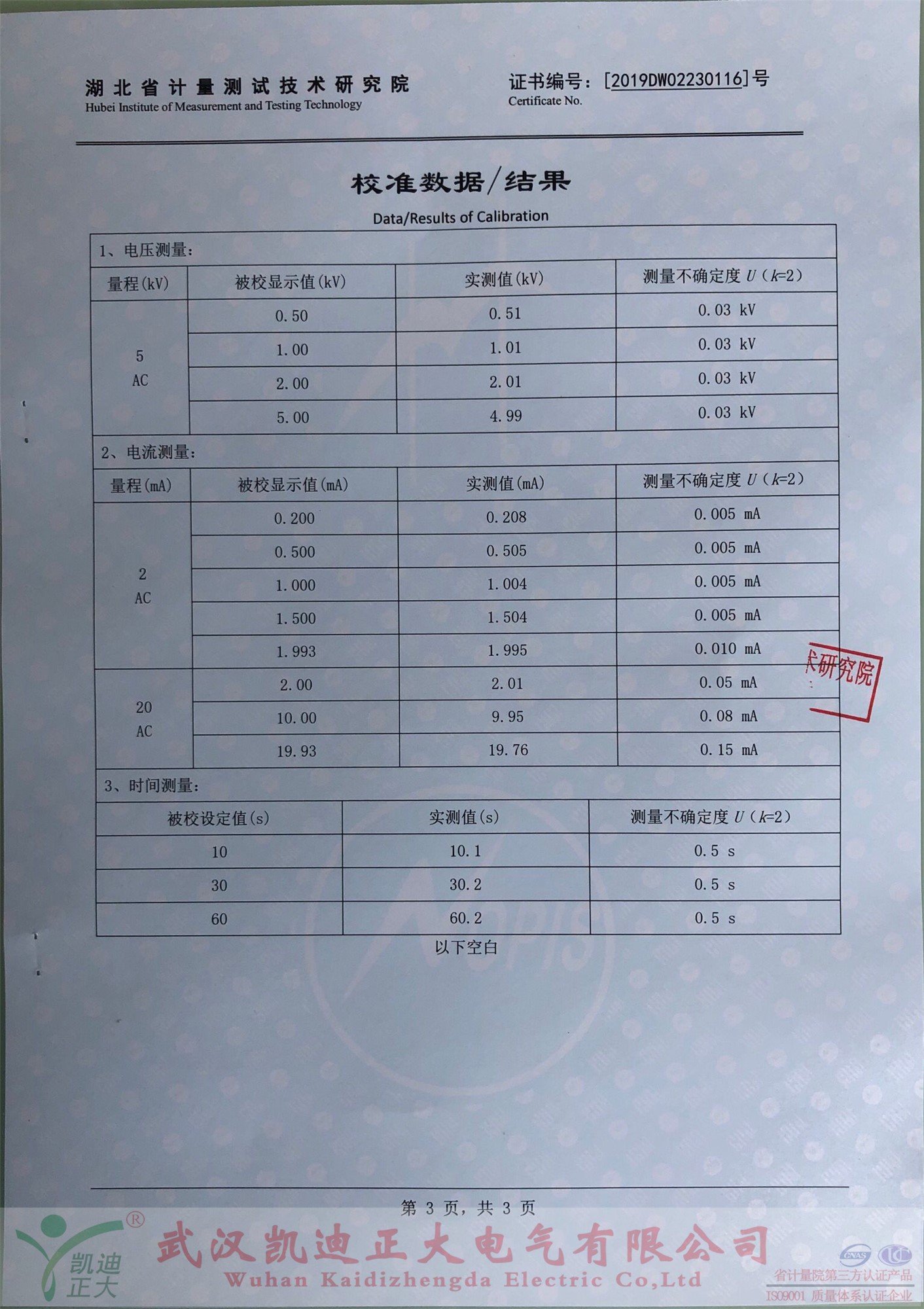 本次校準(zhǔn)所使用的主要計(jì)量標(biāo)準(zhǔn)器具:耐電壓測試儀校驗(yàn)儀