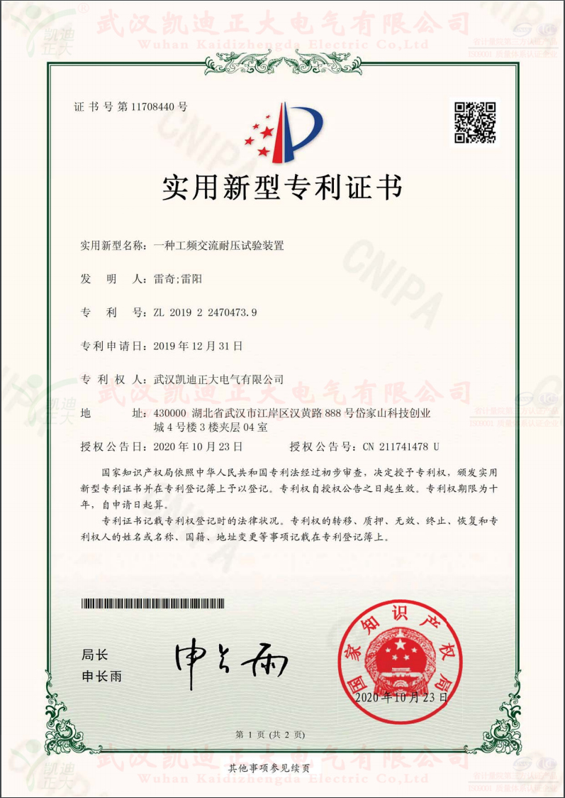 工頻交流耐壓試驗裝置的產(chǎn)品特點、技術(shù)參數(shù)及專利證書