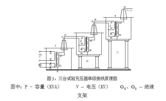 2、三臺高壓試驗變壓器串級獲得更高電壓的結線原理見圖3。