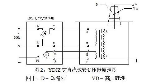 1、高壓試驗變壓器的工作原理圖見圖1、圖2。 圖2中高壓套管中裝有高壓硅堆,串接在高壓回路中作半波整流,以獲得直流高電壓。當用一短路桿將高壓硅堆短接時,可獲得工頻高電壓,作為交流輸出狀態(tài);取消短路桿時,作為直流輸出狀態(tài)。