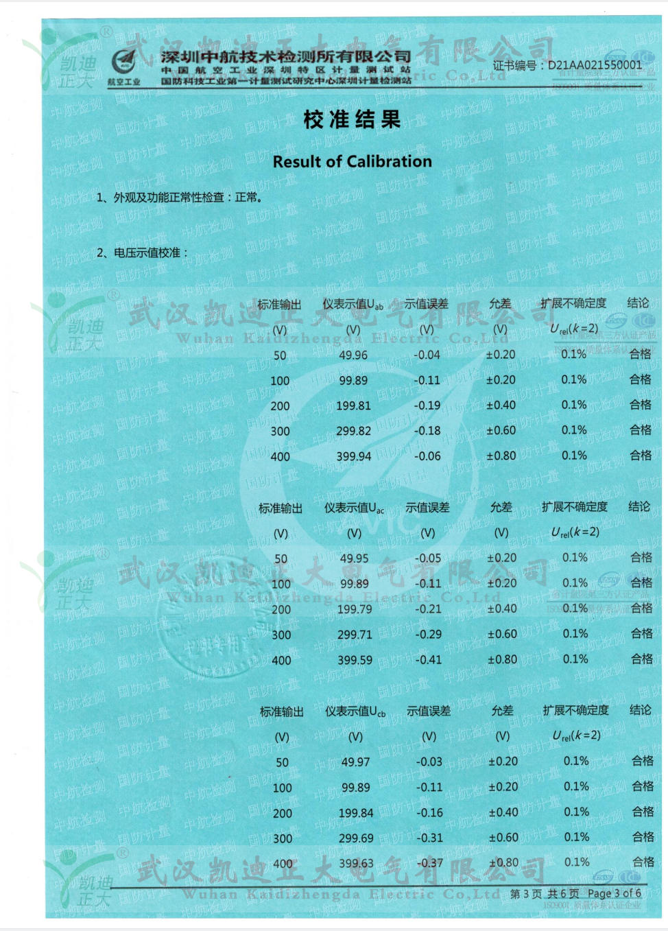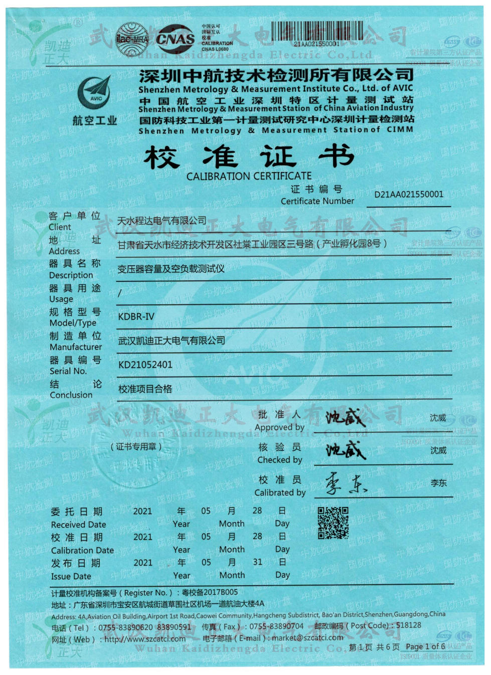KDBR-IV變壓器容量及特性測試儀是我司老客戶天水程達電氣再次采購的,因多次為質檢所等相關單位提供高低壓成套檢測設備,所以程達電氣對我司產品青睞。應要求需要出具中國合格評定國家認可委員會(CNAS)相關單位的電壓示值校準、電流示值校準、功率示值校準等數據。深圳中航技術檢測大多數限公司(中國航空工業(yè)深圳特區(qū)計量測試站/國防科技工業(yè)第一計量測試研究中心深圳計量檢測站 )是航空工業(yè)北京長城計量測試技術研究所、國防科技工業(yè)第一計量測試研究中心于1986年投資建立的計量技術檢測服務機構,是深圳市最早的法定計量檢測機構之一,是具有法定計量、國防計量、軍用計量屬性的第三方公正實驗室。
