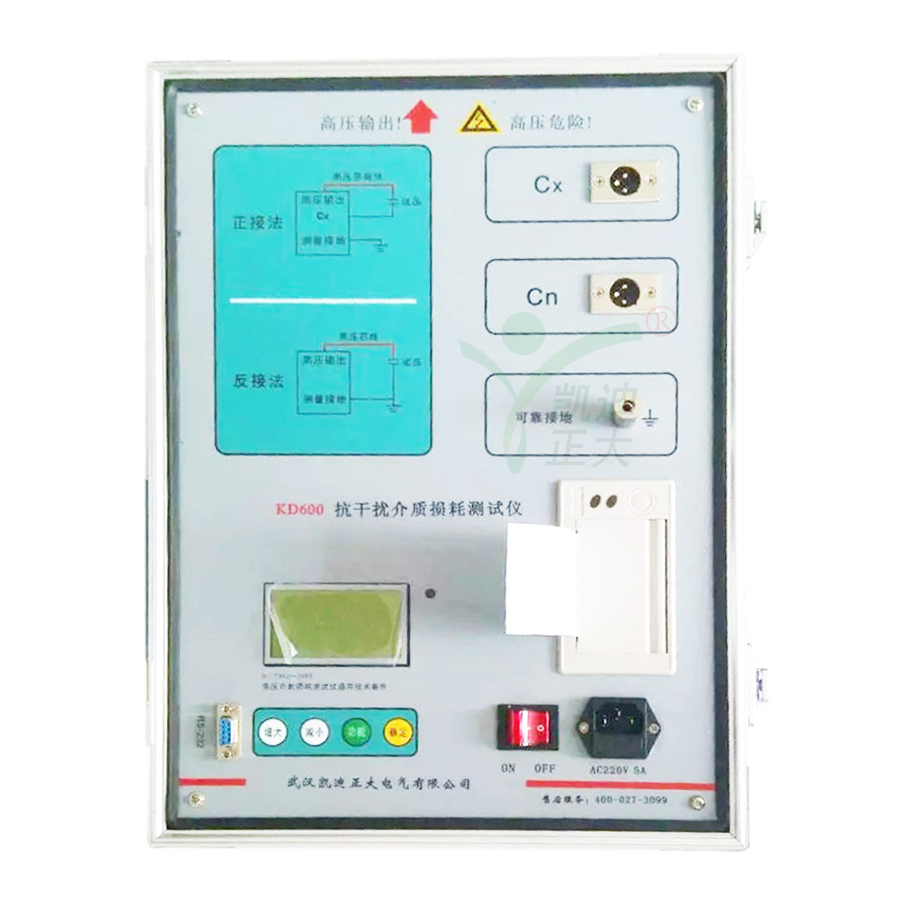 KD600介質(zhì)損耗測(cè)試儀用于現(xiàn)場(chǎng)抗干擾介損測(cè)量,或試驗(yàn)室精密介損測(cè)量。儀器為一體化結(jié)構(gòu),內(nèi)置介損電橋、變頻電源、試驗(yàn)變壓器和標(biāo)準(zhǔn)電容器等。采用變頻抗干擾和傅立葉變換數(shù)字濾波技術(shù),自動(dòng)智能化測(cè)量,強(qiáng)干擾下測(cè)量數(shù)據(jù)非常穩(wěn)定。測(cè)量結(jié)果由大屏幕液晶顯示,自帶微型打印機(jī)可打印輸出。