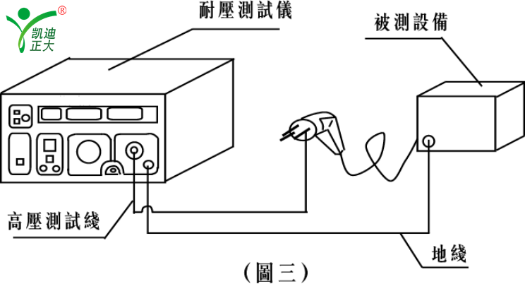 按圖三將耐壓儀與被測整機(jī)連接,接通被測整機(jī)電源開關(guān),根據(jù)被測整機(jī)產(chǎn)品標(biāo)準(zhǔn)設(shè)置漏電流報(bào)警值,然后再按4條或5條所進(jìn)行測試。如若被測整機(jī)產(chǎn)品標(biāo)準(zhǔn)沒有規(guī)定具體漏電流報(bào)警值,則推薦按下式計(jì)算:Iz=Kp(U/R)...............(1)