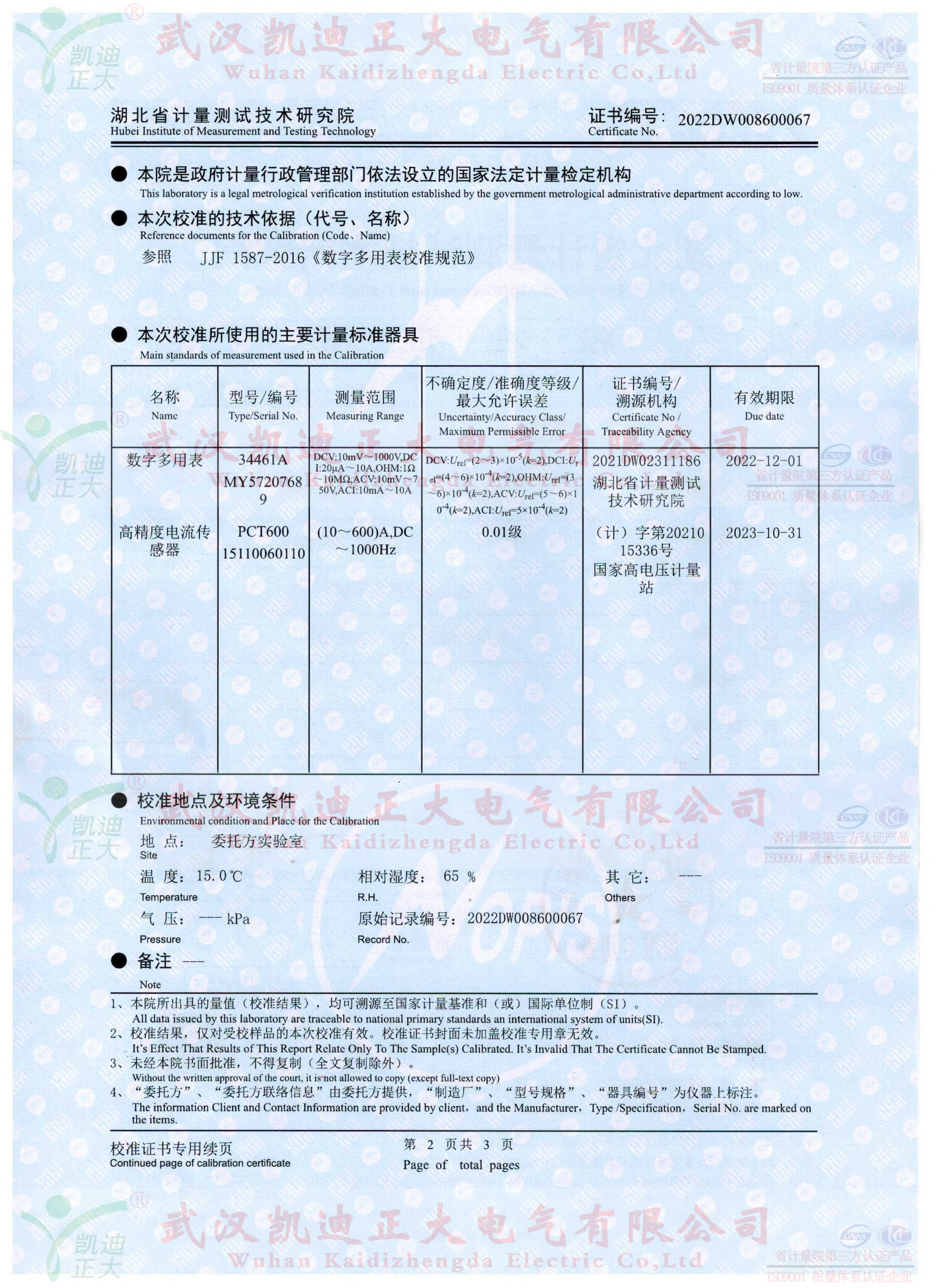 生產(chǎn)KDZD886完成后,送往省計量院。在校準(zhǔn)證書顯示:采用國家高電壓計量站(計)字第2021015336號溯源機(jī)構(gòu)的高精度電流傳感器及數(shù)字多用表檢定電壓示值誤差U=0.2V;電流值U=0.1A的結(jié)果值,符合國家相關(guān)標(biāo)準(zhǔn),滿足測量不確定度。