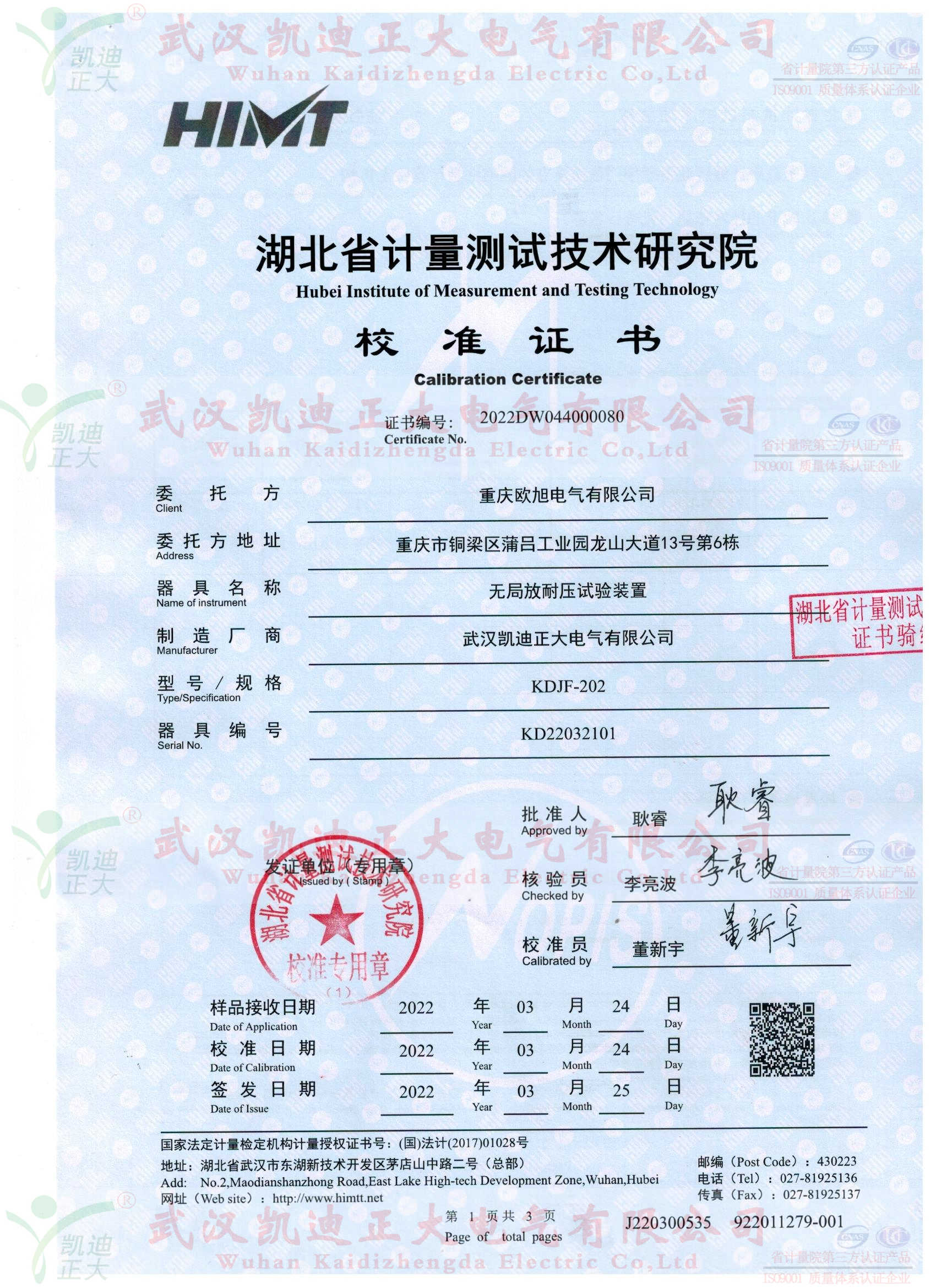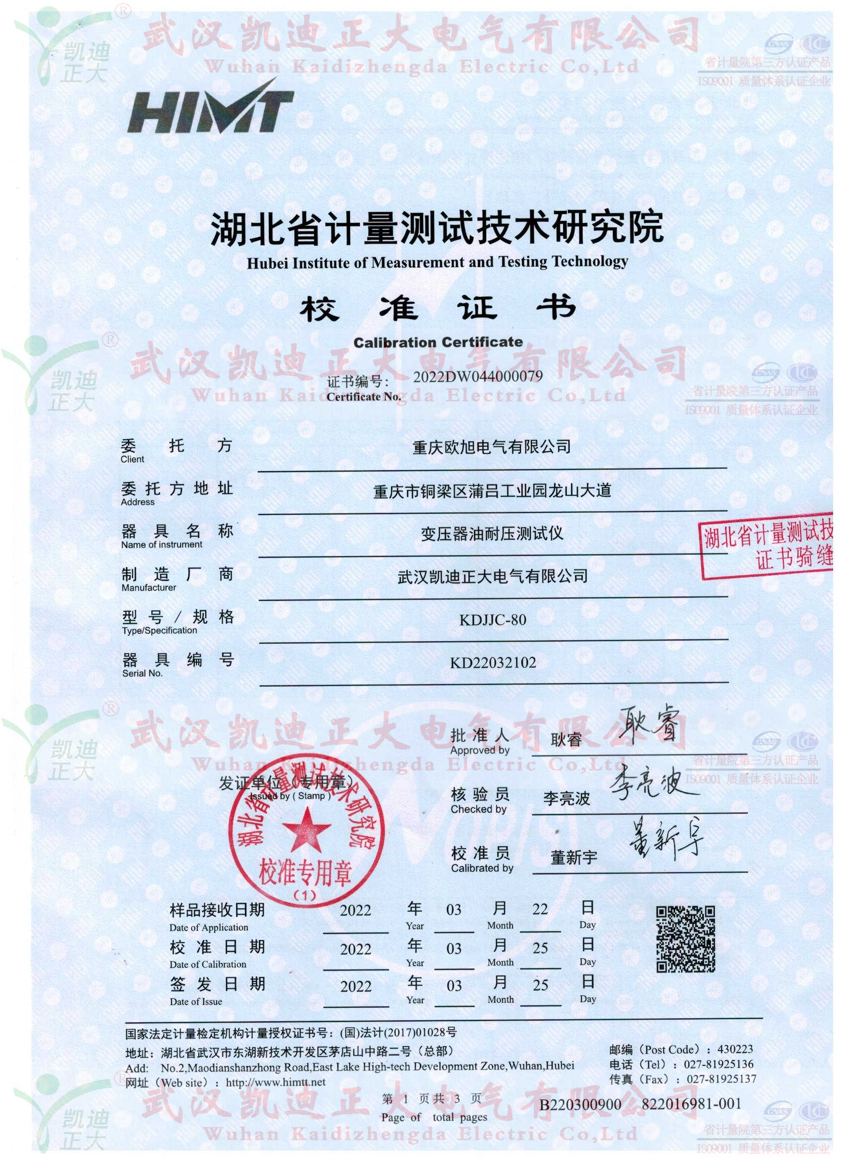 面對市場的優(yōu)劣淘汰趨勢,國網(wǎng)電力公司、南網(wǎng)等各電力企業(yè)對高標準的節(jié)能變壓器有強烈需求。出廠檢測設備是歐旭公司申請資質(zhì)需要的設備,在國內(nèi)優(yōu)質(zhì)變壓器檢測設備公司對比后,選擇我司KDJJC-80變壓器油耐壓測試儀、KD610絕緣油介質(zhì)損耗測試儀、KDJF-202無局放耐壓試驗裝置(10kVA/100kV)、KDZR-10A直流電阻測試儀等試驗設備。驗收標準已湖北省計量測試技術研究院校準證書合格報告為基準,省計量院是政府計量行政管理部門依法設立的國家法定計量檢定機構。校準器溯源國家高電壓計量站(計)字第2021042100號。