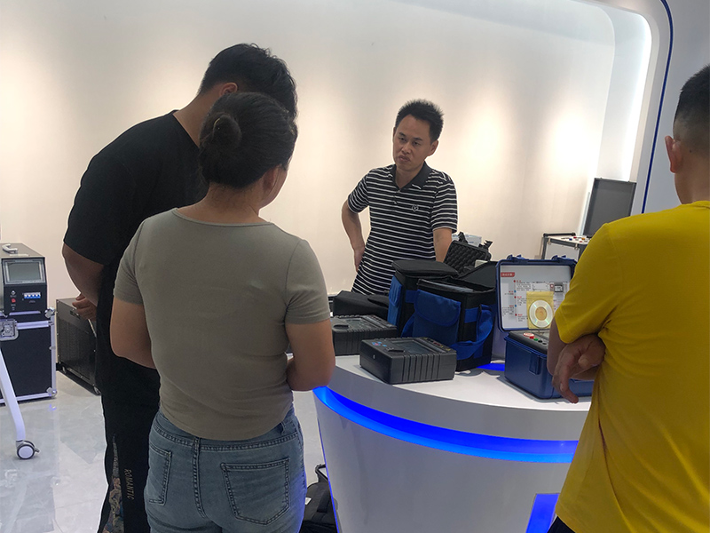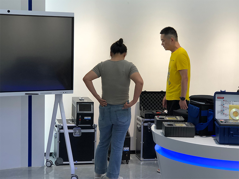 在我公司趙總與王工的陪同下,安徽某電力公司代表首先參觀了寬敞明亮的設(shè)備展廳。這里陳列著各類電力檢測設(shè)備,趙總與王工對展廳陳列的設(shè)備做了大致的講解。并對三相繼電保護(hù)測試儀、變壓器容量測試儀及變頻抗干擾介質(zhì)損耗測試儀進(jìn)行了細(xì)致介紹。