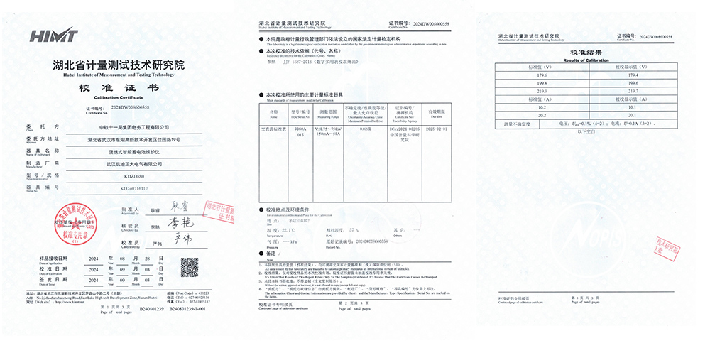 KDZD880便攜式智能蓄電池維護(hù)儀在交付前,順利通過了湖北省計(jì)量測試技術(shù)研究院的嚴(yán)格檢測。此次檢測嚴(yán)格遵循JJF 1587-2016《數(shù)字多用表校準(zhǔn)規(guī)范》,對設(shè)備的測量精度、穩(wěn)定性、安全性等關(guān)鍵指標(biāo)進(jìn)行了全面評估。結(jié)果顯示KDZD880的各項(xiàng)性能指標(biāo)均達(dá)到標(biāo)準(zhǔn)要求,為用戶的信賴與選擇提供了堅(jiān)實(shí)的數(shù)據(jù)支撐。