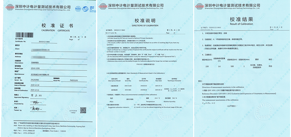 近日,廣東某能源發(fā)展有限公司訂購我司的KDHX-3208無線核相儀順利通過了深圳中電計(jì)量測試技術(shù)有限公司的專業(yè)校準(zhǔn),獲得校準(zhǔn)證書。