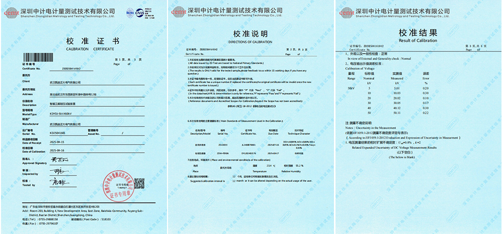近日,武漢凱迪正大電氣有限公司生產(chǎn)的KDYDJ-5kVA50kV智能工頻耐壓試驗裝置,通過深圳中計電計量測試技術(shù)有限公司的校準測試。此次校準驗證了產(chǎn)品的性能,特別是輸出電壓的準確性和穩(wěn)定性。
