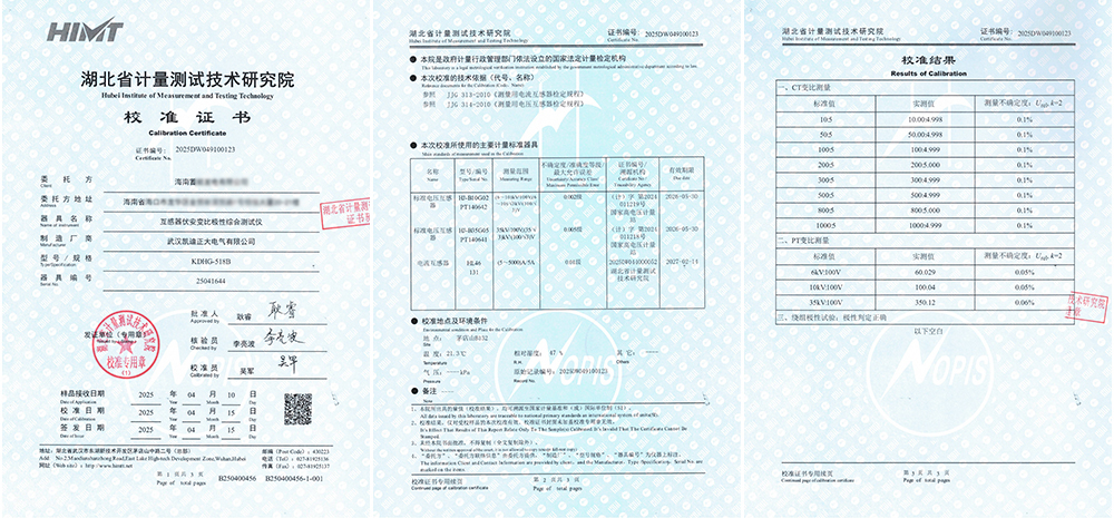 近日,海南某發(fā)電有限公司采購武漢凱迪正大的兩套KDHG-518B互感器伏安變比極性綜合測試儀,均成功通過了湖北省計量測試技術研究院的嚴格校準,并順利取得校準證書。