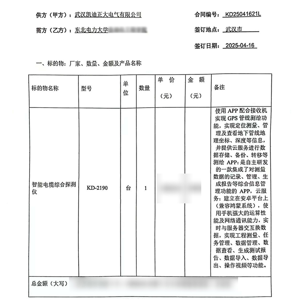 近日,東北電力大學(xué)經(jīng)過嚴(yán)格篩選與評估,最終選擇了武漢凱迪正大電氣的KD-2190智能電纜綜合探測儀。此次采購不僅彰顯了東北電力大學(xué)對武漢凱迪正大電氣品牌與技術(shù)的信賴,更標(biāo)志著KD-2190智能電纜綜合探測儀可靠的性能和質(zhì)量。