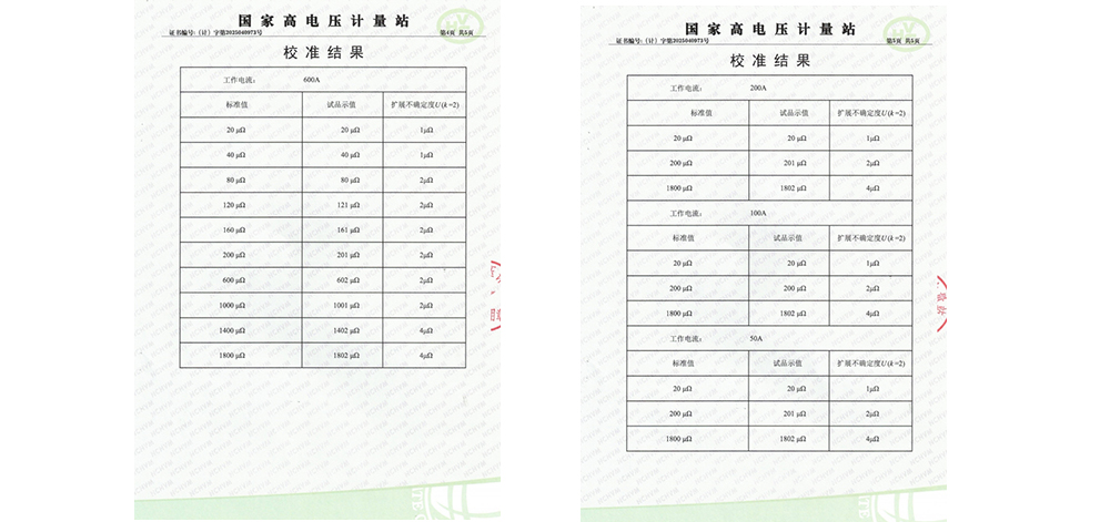 在校準過程中,國家高電壓計量站采用了最大充許誤差為±0.1%讀數(shù)的直流大功率標準電阻作為校準器具,校準環(huán)境為溫度21℃℃、濕度56%RH。校準內(nèi)容包括對測試儀在600A、200A、100A、50A不同電流下的測量結果。經(jīng)過一系列嚴格的測試和比對,KDHL-600A回路電阻測試儀成功通過了校準。