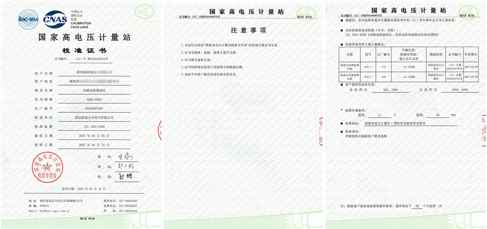 近日,國網(wǎng)湖南省某有限公司采購的武漢凱迪正大KDHL-600A回路電阻測試儀,順利通過了國家高電壓計量站的嚴格校準,并獲得了校準證書。