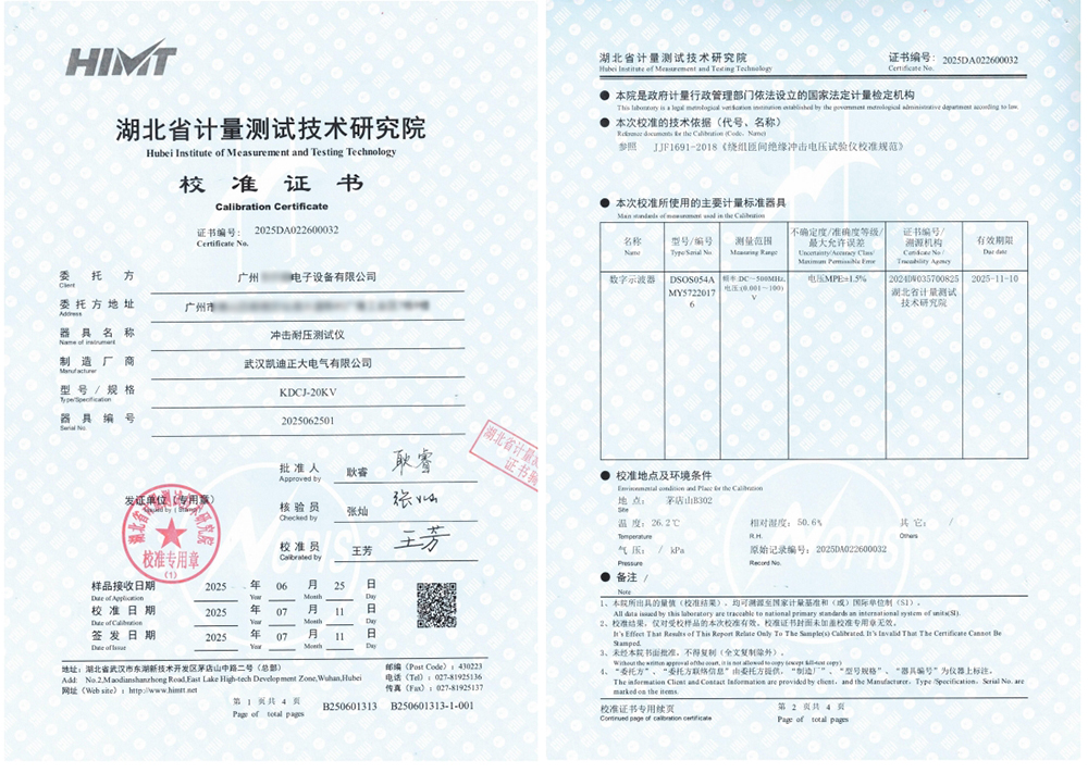 2025年7月11日,廣州某電子設(shè)備有限公司向武漢凱迪正大電氣采購的KDCJ-20kV沖擊耐壓測試儀,通過湖北省計(jì)量測試技術(shù)研究院的專業(yè)校準(zhǔn),驗(yàn)證了測試儀的準(zhǔn)確性和可靠性。